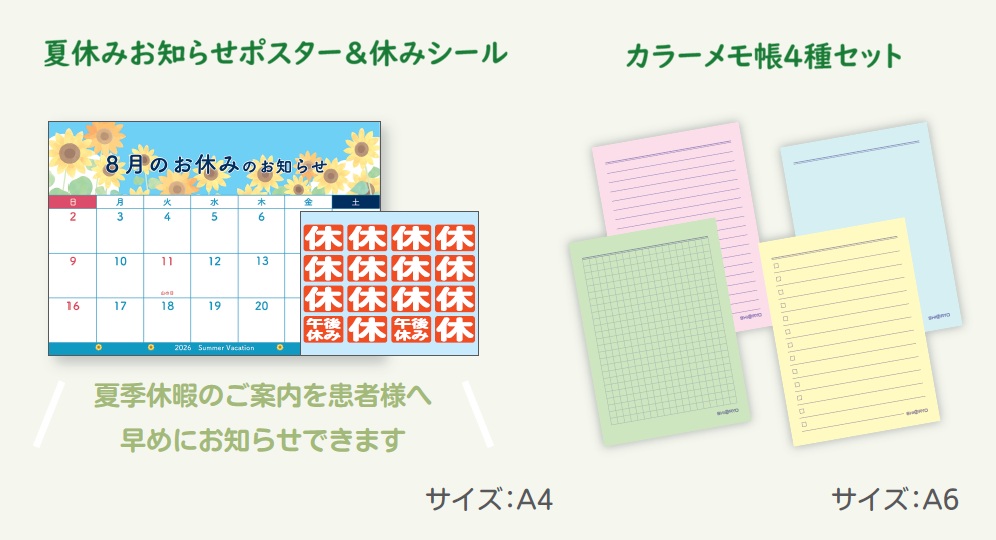 当WEBアンケートにお答えいただいた方には、夏休みお知らせポスター&休みシールとメモ帳4種セットをプレゼント♪